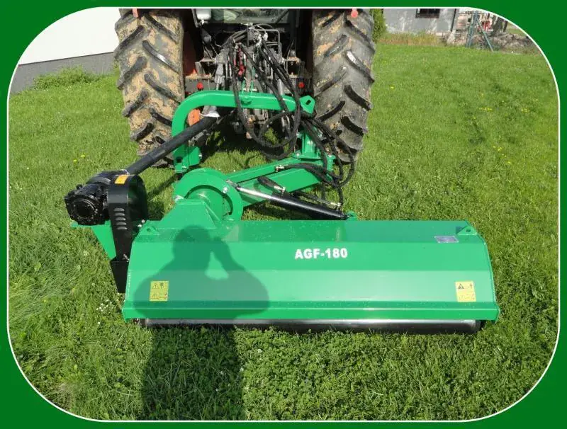Opis: Kosiarki AGF tylnoboczne uzupełniają naszą ofertę maszyn klasy ciężkiej do utrzymania terenów zielonych i dróg. Są to maszyny spełniające oczekiwania zarówno firm świadczących usługi rolnicze jak i służb komunalnych. Wysoka jakość wykonania oraz wyjątkowa trwałość komponentów są gwarancją niezawodnej pracy nawet przy obciążeniu przekraczającym 1500 roboczogodzin rocznie. Kosiarki bijakowe - mulczery przeznaczone są do prac związanych z utrzymaniem infrastruktury komunalnej, zieleni miejskiej oraz sadów. Maszyny tego typu stosowane są do koszenia trawy, zarośli, drobnych krzaków i ścinania chwastów na terenach niezagospodarowanych z zamiarem pozostawienia pokosu. Szczególnie przydatne są do koszenia poboczy dróg, rowów przydrożnych, oraz skarp i przeciwskarp. Mulczery mają za zadanie skosić trawę i odpowiednio rozdrobnioną rozrzucić równo po całej skoszonej powierzchni. Pozwala to na uzyskanie naturalnego pokosu, mineralizację resztek roślinnych i ponowne wprowadzenie ich do gleby. Charakterystyka: 1. Przeniesienie napędu za pomocą przekładni pasowej pełni rolę sprzęgła przeciążeniowego, 2. Nowa mocniejsza obudowa została dodatkowo zabezpieczone przed uszkodzeniami zewnętrznymi. Przeznaczenie: Kosiarka bijakowa klasy ciężkiej przeznaczona do koszenia poboczy drogowych, wykaszania rowów, skarp oraz do pracy na terenach zielonych (sady, winnice). Zalety: 1. Odpowiednio dobrana masa bijaka oraz precyzyjne zamocowanie i rozmieszczenie śrubowe na wale sprawiają, że kosiarka pracuje skutecznie w trudnych warunkach, 2. Mocowanie za pomocą trzypunktowego układu zawieszenia z tyłu ciągnika, 3. Prosta wymiana bijaków, 4. Idealne dopasowanie do podłoża oraz równomierna wysokość koszenia, 5. Regulacja wysokości koszenia 6. Wzmocniona obudowa 7. Kosiarki te charakteryzują się szerokim zakresem pracy w poziomie, co umożliwia omijanie przeszkód (np. znaków drogowych, drzew) bez zmiany toru jazdy ciągnika, 8. Pozwala na pracę zarówno z boku jak i za ciągnikiem, 9. Możliwość koszenia powierzchni o nachyleniu + 90° - 60°, - tylno-boczna - hydrauliczna - 90 stopni w górę i 60 stopni w dół - szerokość robocza 180cm - waga 590kg - kosiarka jest mocowana na 3-punktowym zawieszeniu (KAT, II) - ilość młotków - 16szt. - napędzana WOM 540obr/min ( wałka nie ma w zestawie) - bardzo dobra jakość rozdrabniania, koszenia - zapotrzebowanie na moc od 60KM Oferujemy również osprzęt do mini traktorków ogrodniczych: