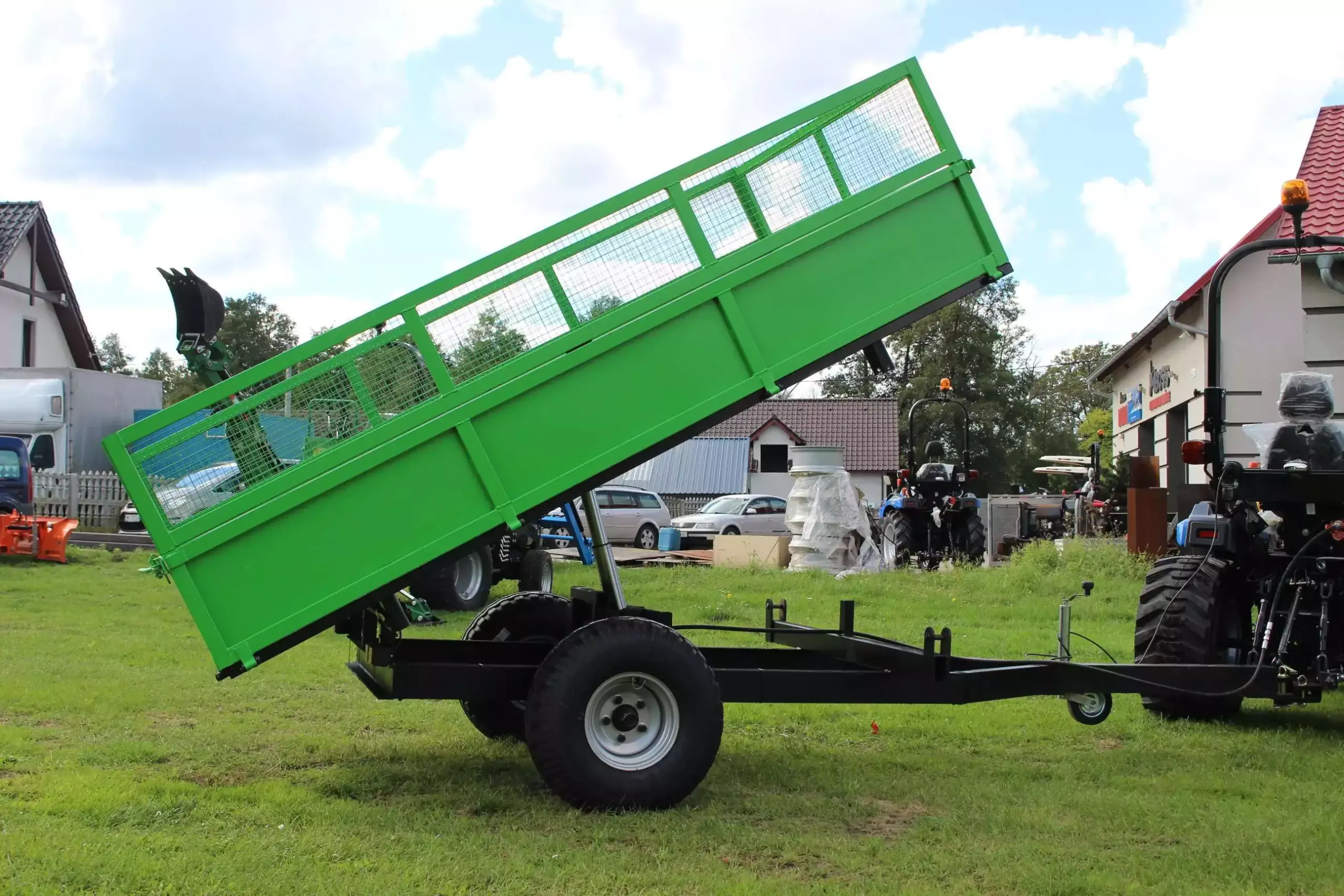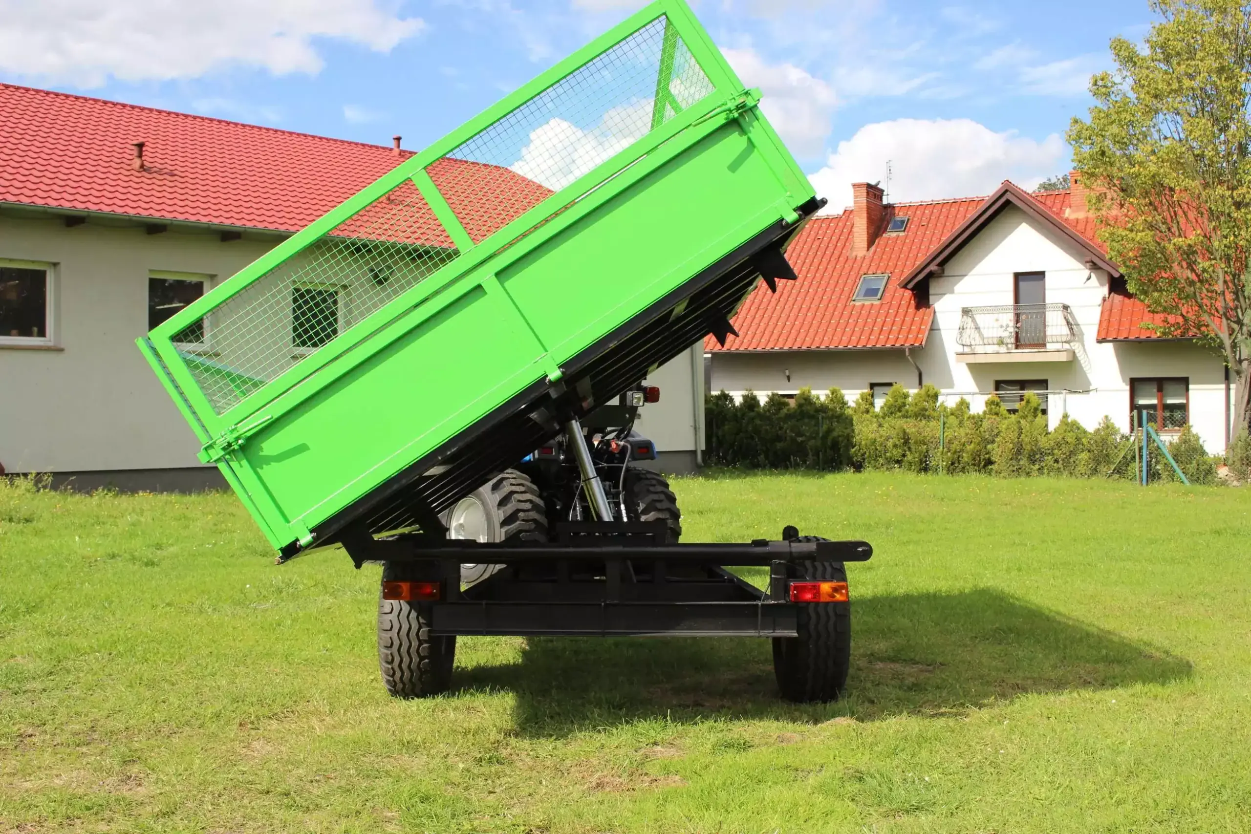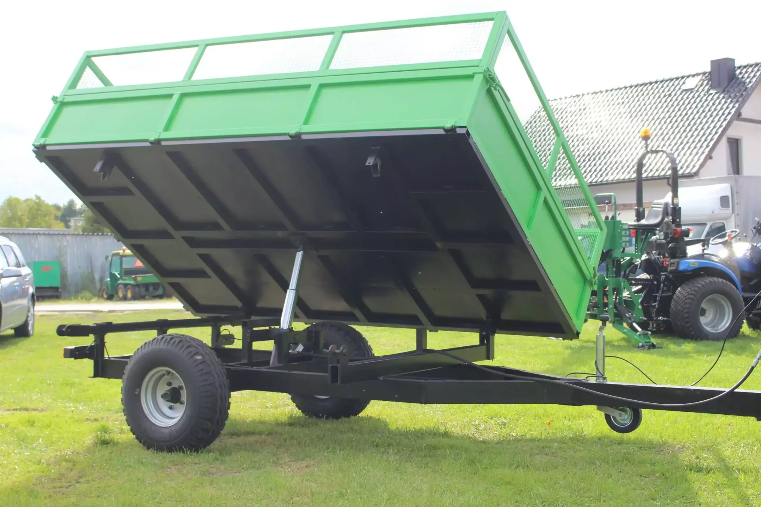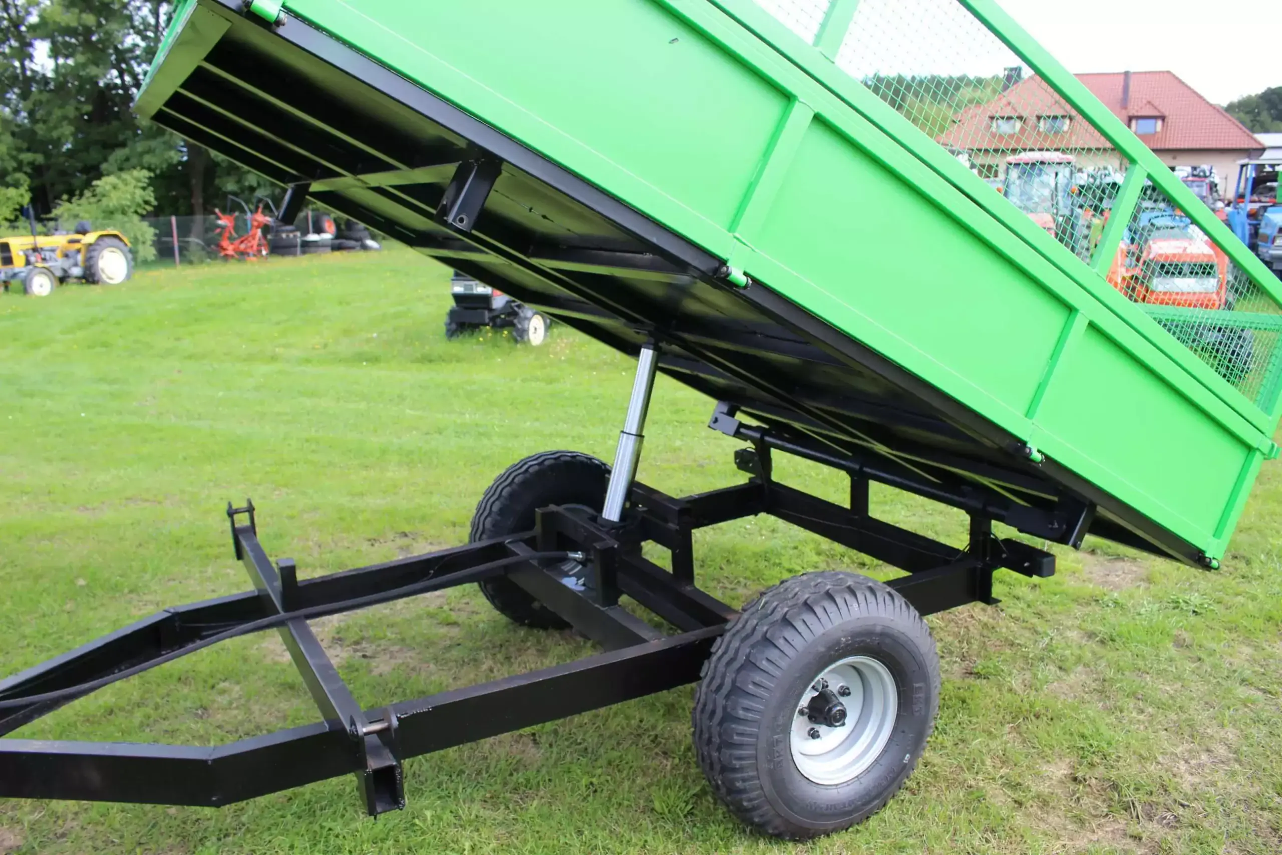 Przyczepa posiada w standardzie bogate wyposażenie. Trzystronny wywrót skrzyni ładunkowej zwiększa funkcjonalność przyczepy. Kulowy, stabilny system wywrotu, sprawdzone, wytrzymałe profile ram nośnych oraz wysokiej jakości, niezawodne i trwałe osie jezdne wyróżniają produkt wśród innych produktów na rynku.     * Ładowność: 2000 kg