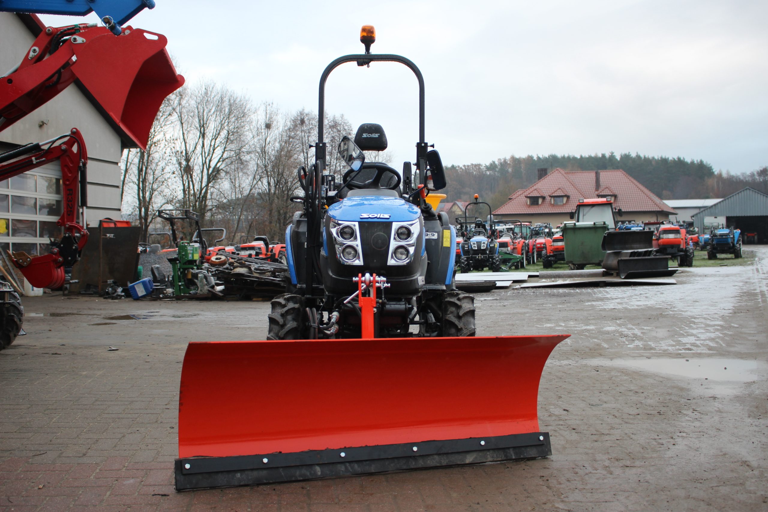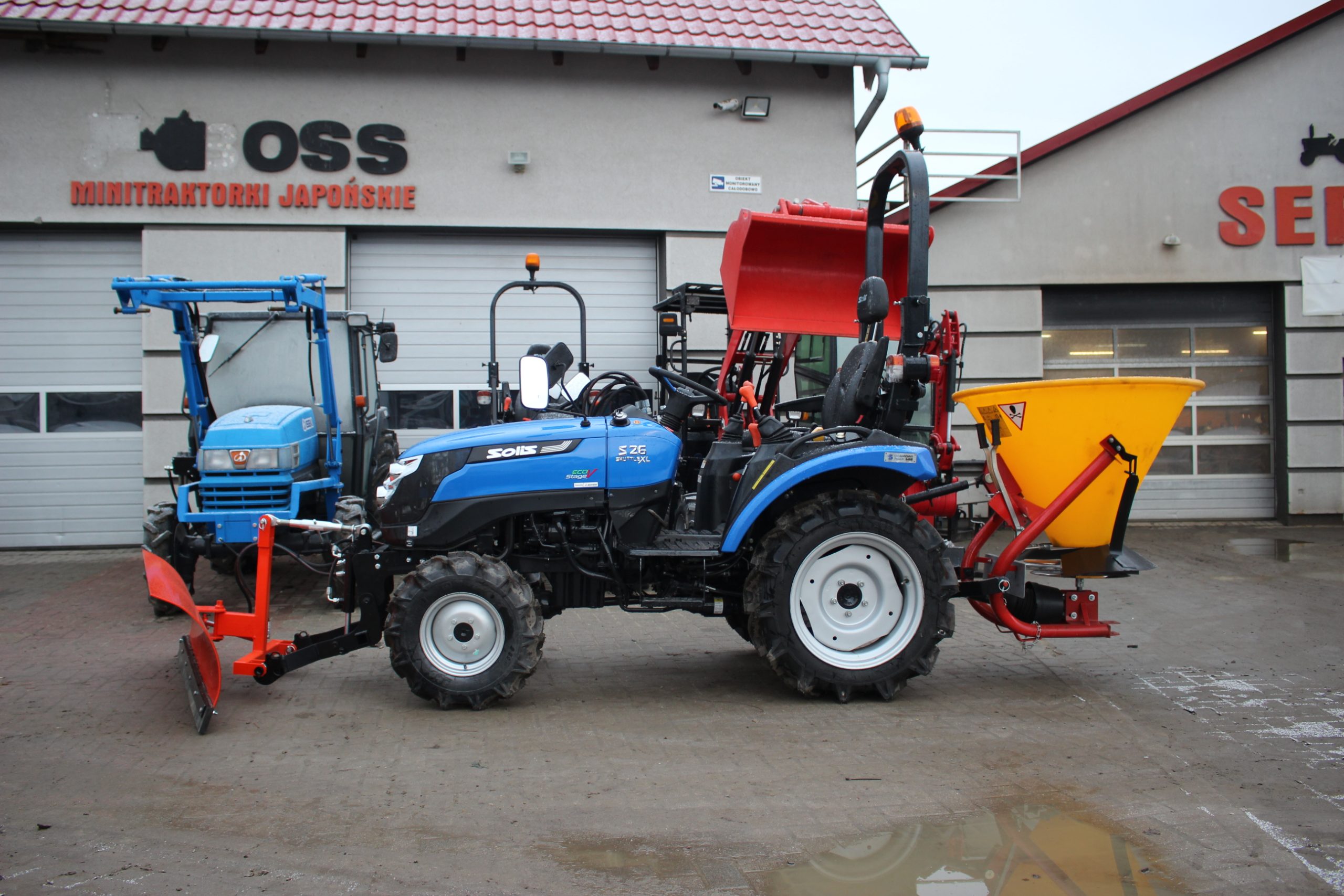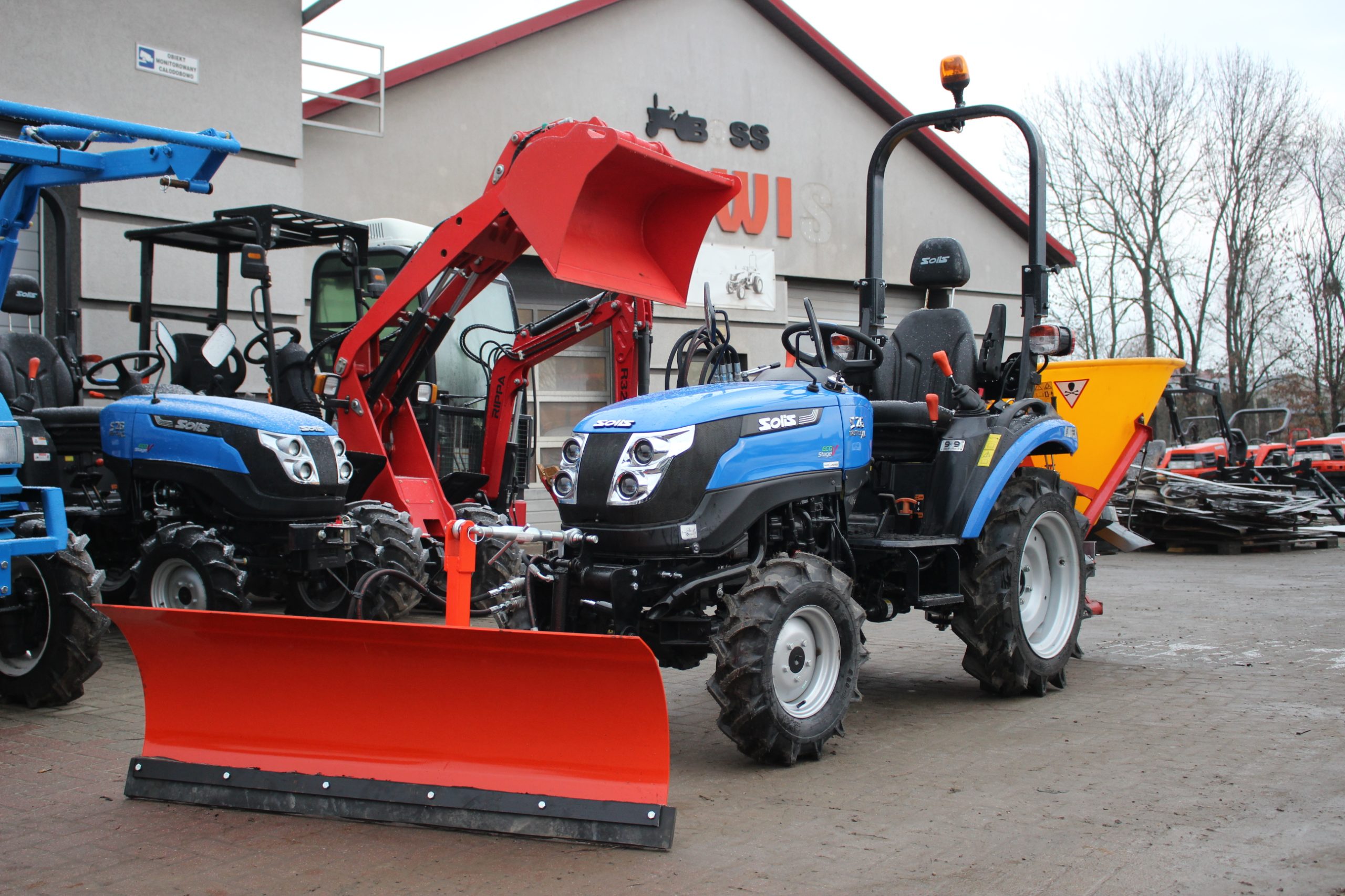 SOLIS 26 9+9 ShuttleXL z przenim TUZ-em i pługiem do śniegu na kołach rolniczych.